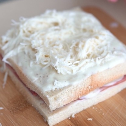 Traditionally, the croque monsieur uses gruyère cheese. However, I live in a place that doesn't have easy access to this cheese. So for those of you who have the same problem, the solution is emmental.