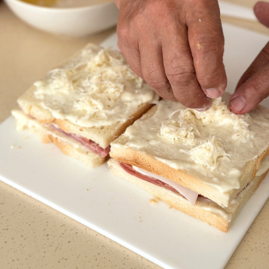 Bread > Béchamel > Ham > Béchamel > Sliced Cheese > Béchamel > Bread > Béchamel > Grated Cheese with Milk